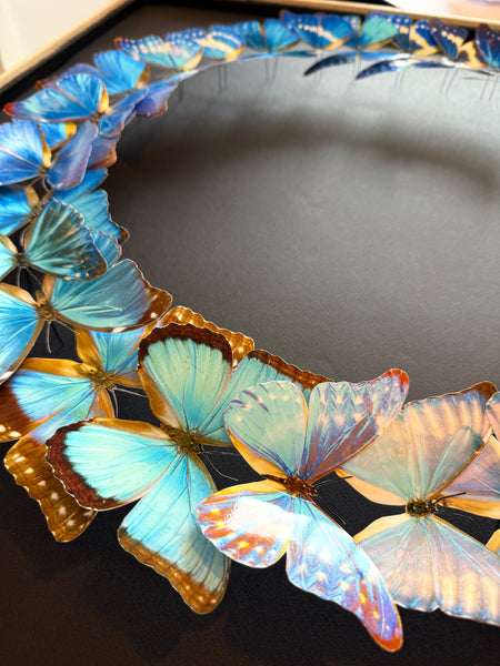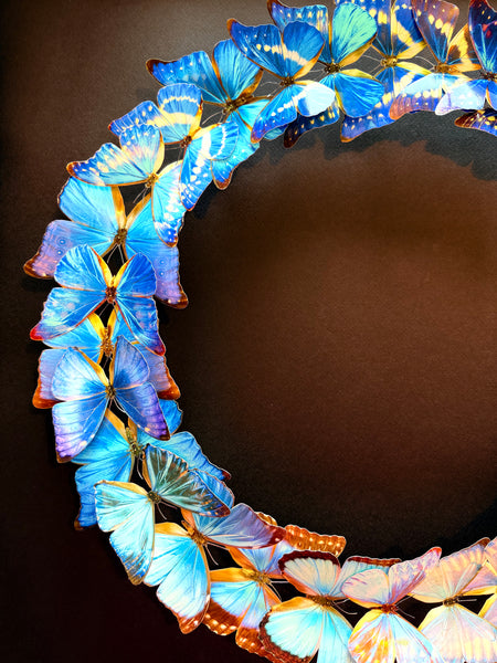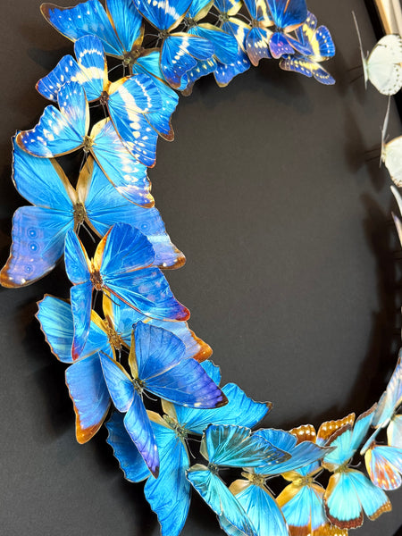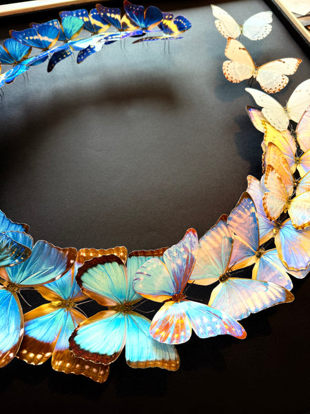 Envolée Azur déploie un cercle vibrant de papillons en papier, reproduits à taille réelle d’après les morphos, célèbres pour leurs ailes aux reflets bleus. Dans une harmonie subtile, le dégradé conduit du bleu profond vers la clarté du blanc, comme une métamorphose de l’ombre vers la lumière.