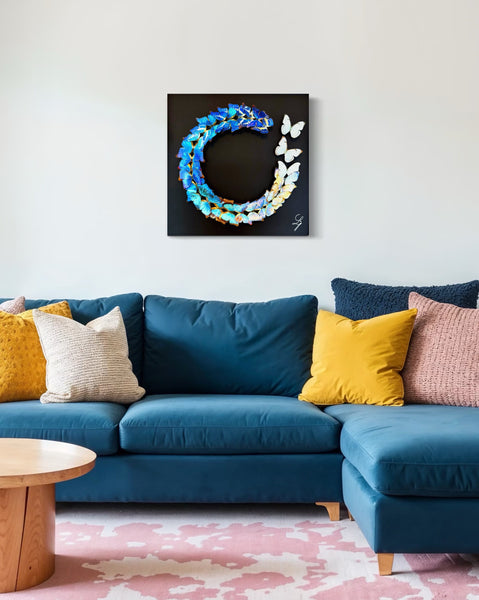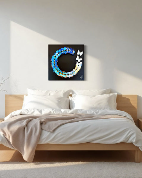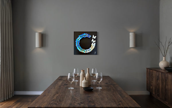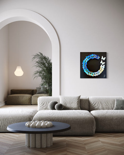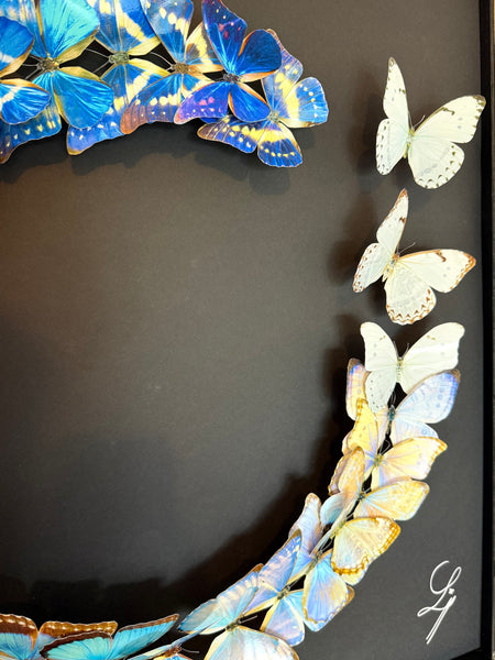 Au fil du cercle, certains papillons blancs s’échappent et rompent la perfection de la forme, donnant l’impression d’un mouvement vivant, d’une liberté qui se déploie. L’œuvre évoque à la fois la beauté fragile de la nature et la puissance d’un élan intérieur : ce moment suspendu où l’on quitte le cycle immuable pour suivre son propre chemin.