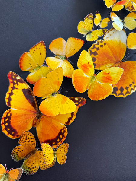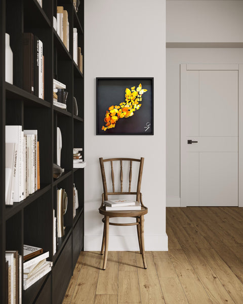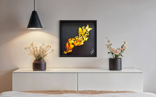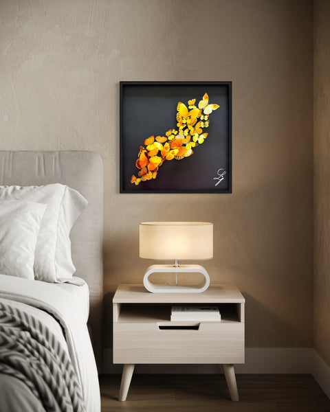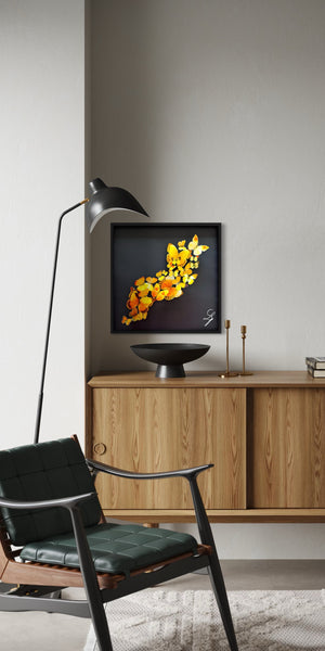 La couleur jaune, éclatante et solaire, incarne l’énergie vitale, la chaleur et la renaissance. Dans ce vol collectif, chaque papillon semble porté par un même élan, symbole d’un mouvement commun vers la lumière.