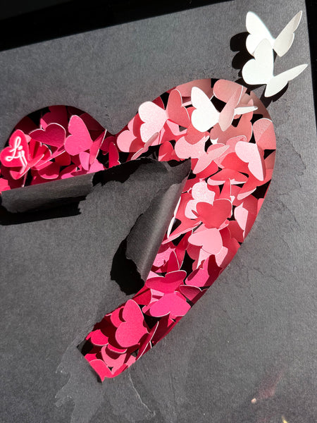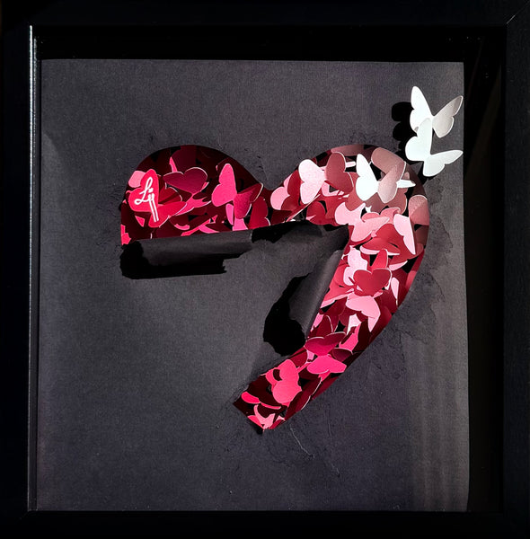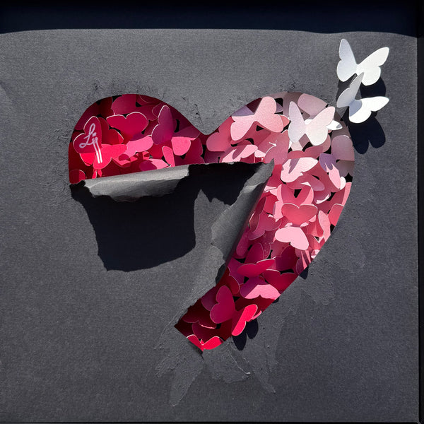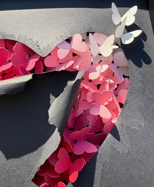 De nombreux papillons colorés, rassemblés en forme de cœur, unissent leur élan. Par leur solidarité, ils gagnent en puissance et percent le voile sombre qui les recouvre. Le papier noir se déchire sous leur mouvement, s’ouvre en cœur, laissant passer la lumière. Certains papillons parviennent à s’envoler, fragiles mais libres, portés par une énergie nouvelle.