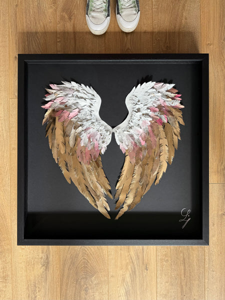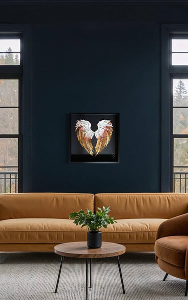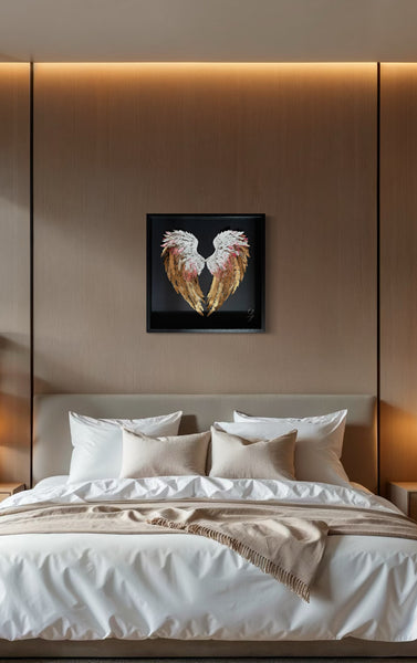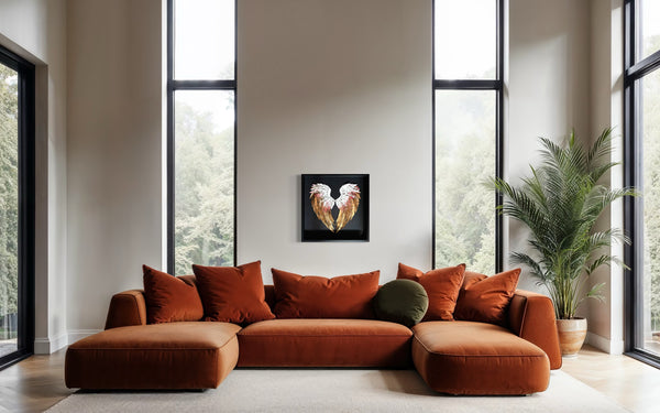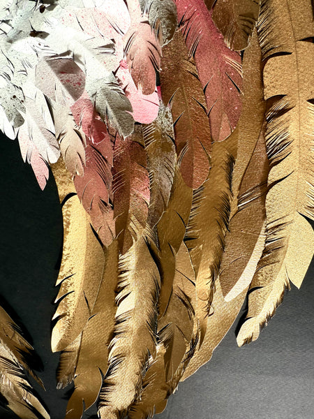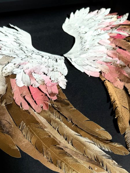 "L'amour donne des ailes" est une œuvre poétique où le cœur se compose de deux ailes délicatement rapprochées, comme un écrin intime. Réalisées en fines plumes de papier, elles s’habillent de blanc et d'or, couleurs douces et lumineuses qui évoquent la pureté, la tendresse et la précieuse intensité des sentiments.