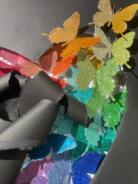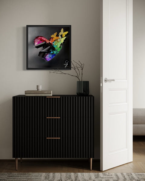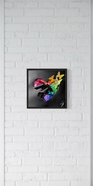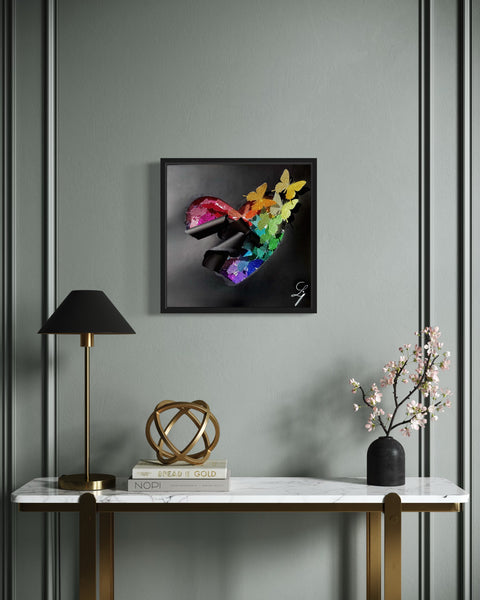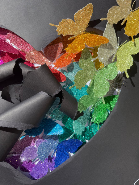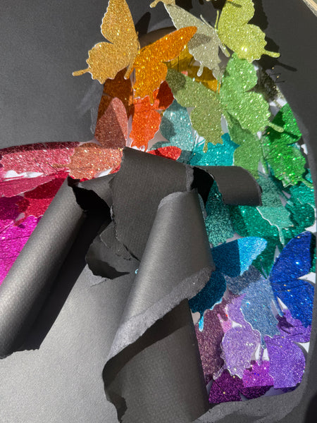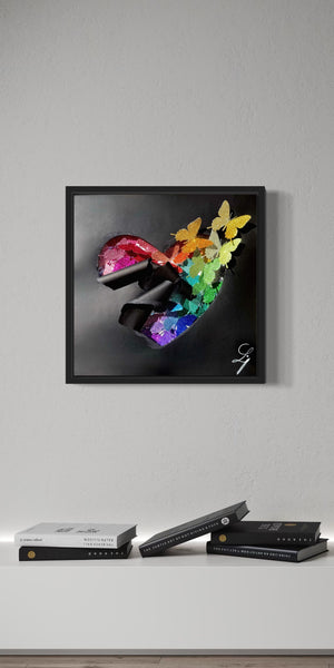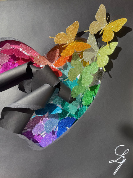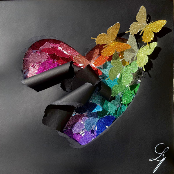 L’Amour donne des ailes explore la puissance lumineuse de l’amour, capable de transformer la fragilité en élan. Dans un cadre noir, un cœur déchiré s’ouvre comme une brèche, laissant s’envoler une nuée de papillons en papier, chacun couvert de paillettes et teinté d’une couleur unique. Ensemble, ils composent un colorama vibrant, un arc-en-ciel de vie, symbole d'émotions qui traversent l’ombre pour renaître en couleur.